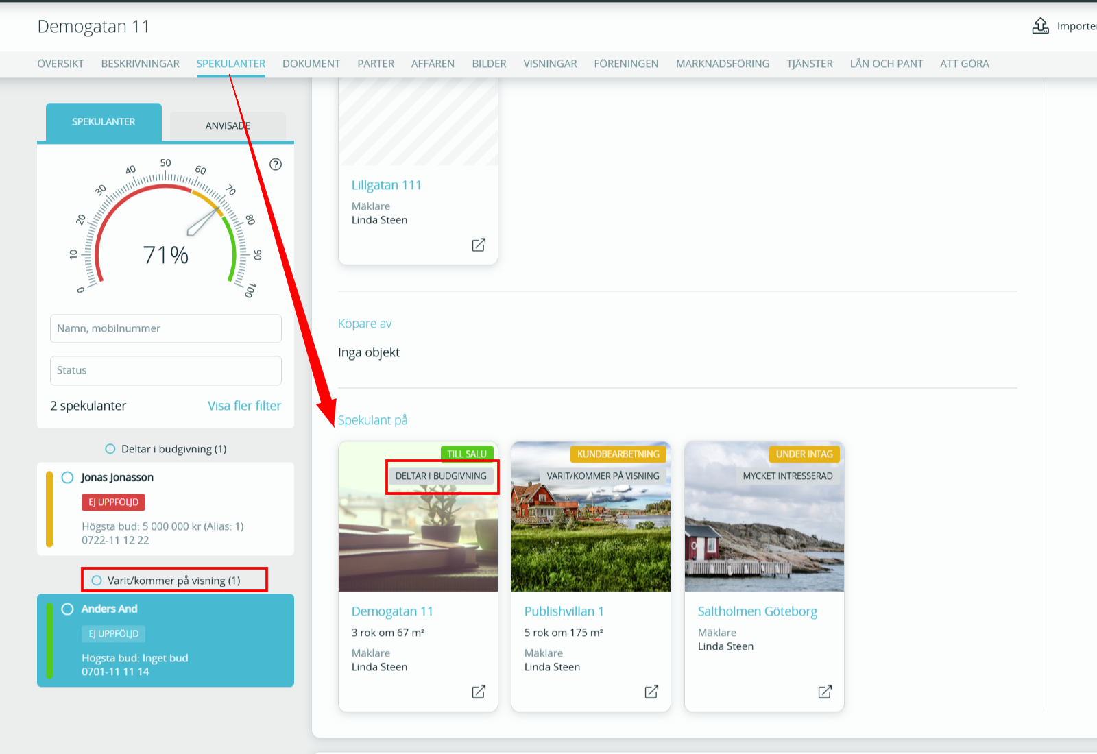 I exemplet har spekulanten Anders statusen Varit/ kommer på visning men skylten visar deltar i budgivning.