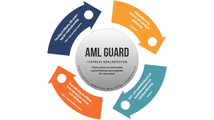 AML Guard är utvecklad för att samla alla delar av AML-processen i en och samma lösning. Den kombinerar en strukturerad tjänsteleverans med ny funktionalitet direkt i Express Mäklarsystem. Tjänstedelen hanteras av Acuminor och omfattar: • Digital allmän riskbedömning genom Riskportal • Rutiner och riktlinjer för AML-arbetet genom Riskportal • Utbildning online genom Riskportal