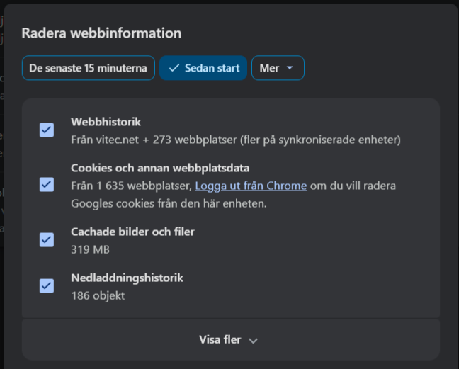För att rensa cache i webbläsaren Chrome och minska störningar i Express Mäklarsystem gör du så här: rensa webbinformation, cookies och cachade bilder. Efter rensningen behöver du logga in i Express igen. En fullständig rensning kan ibland vara nödvändig om problem kvarstår.