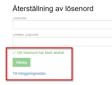 - Fyll i det nya lösenordet två gånger. När det är tillräckligt starkt visas en bekräftelse att lösenordet är ändrat.