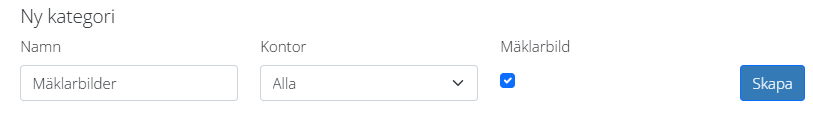 Om kategorin inte finns kan du klicka på symbolen med pennan för att skapa upp en kategori för användarbilder. Du kan döpa kategorin till vad du vill, så länge du bockar för att kategorin ska användas för Mäklarbilder.