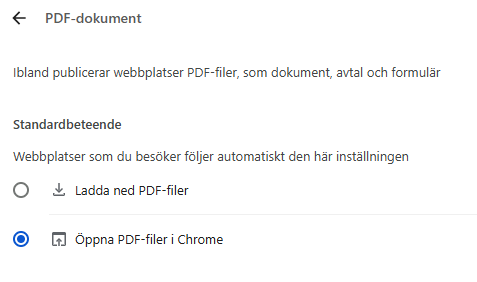 - Här ställer du in om du vill att dokumenten ska öppnas direkt i Chrome för utskrift, eller om du vill att de skall laddas ner först.