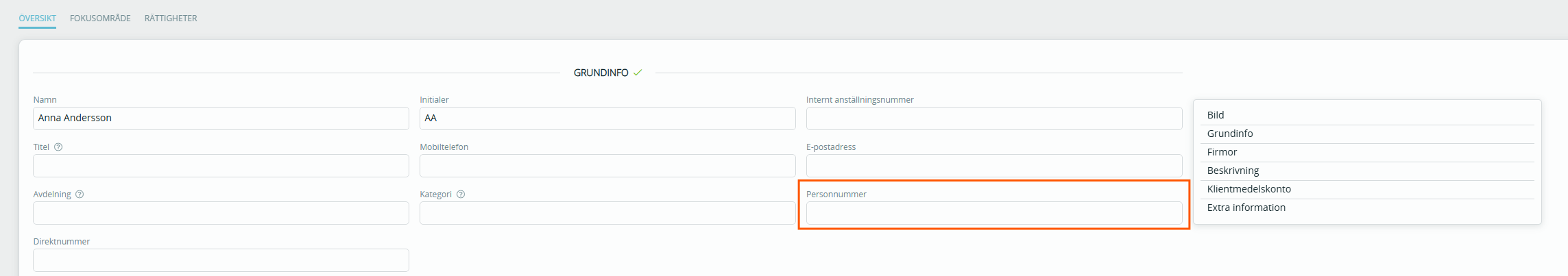 Om du möter denna text betyder det att du saknar rättigheter att ändra själv. Då måste du kontakta någon som har behörighet på kontoret, till exempel kontorschef eller HK. De kan antingen komplettera ditt personnummer eller ge dig rättigheter att ändra själv.