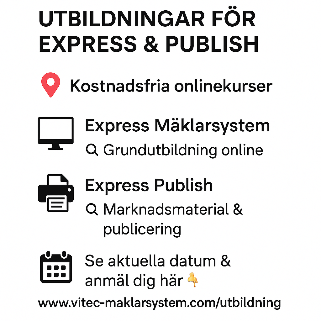 Ja, det hålls regelbundet kostnadsfria utbildningar på distans för både Express Mäklarsystem och Express Publish. Du kan se aktuella datum och vilka online-utbildningar som erbjuds just nu på vår utbildningssida.