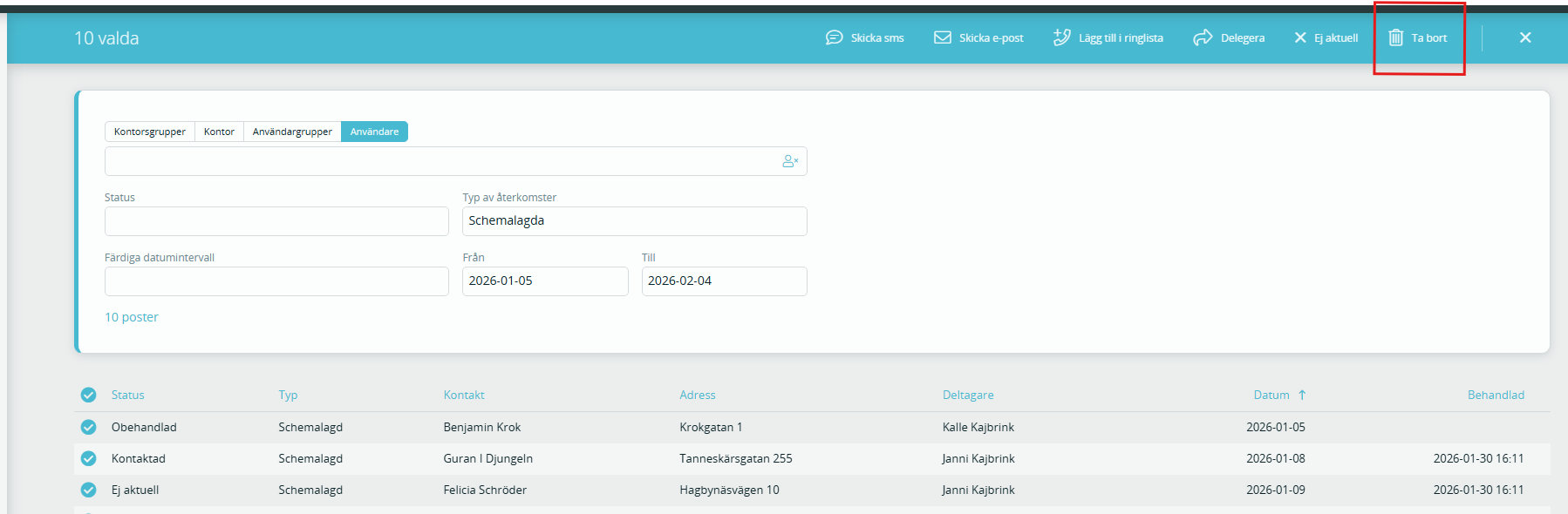 - Filtrera fram de återkomster som önskas tas bort i CRM rapporten.